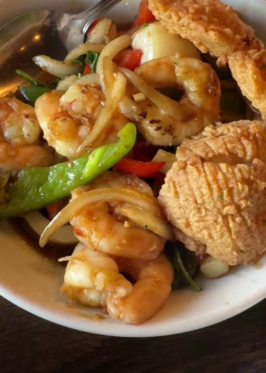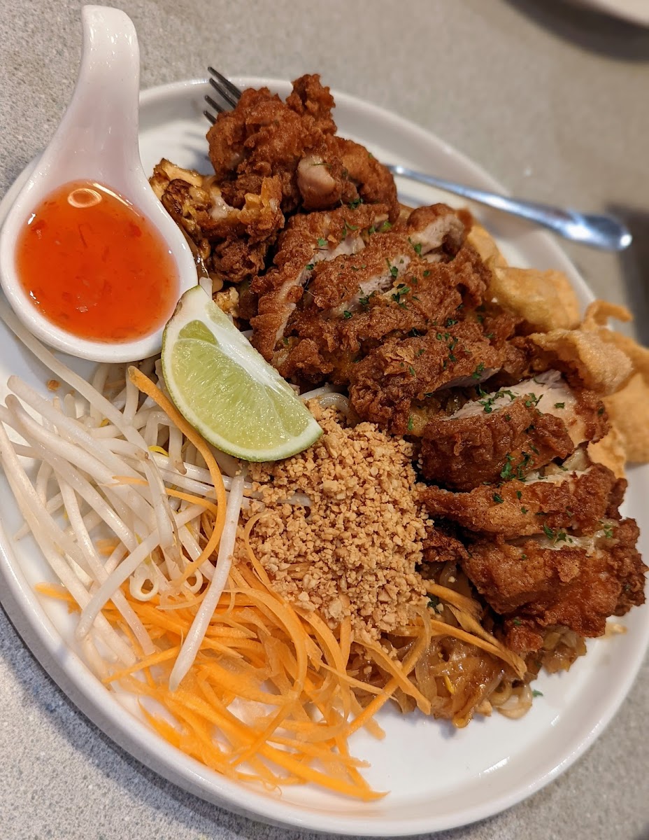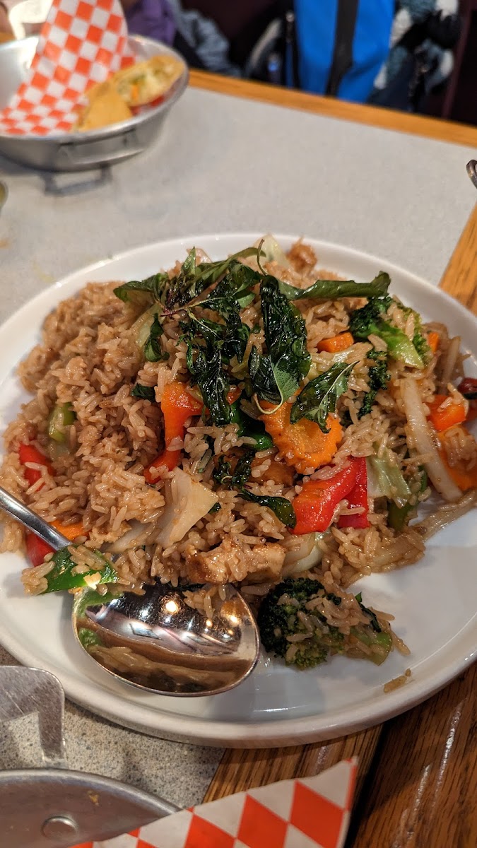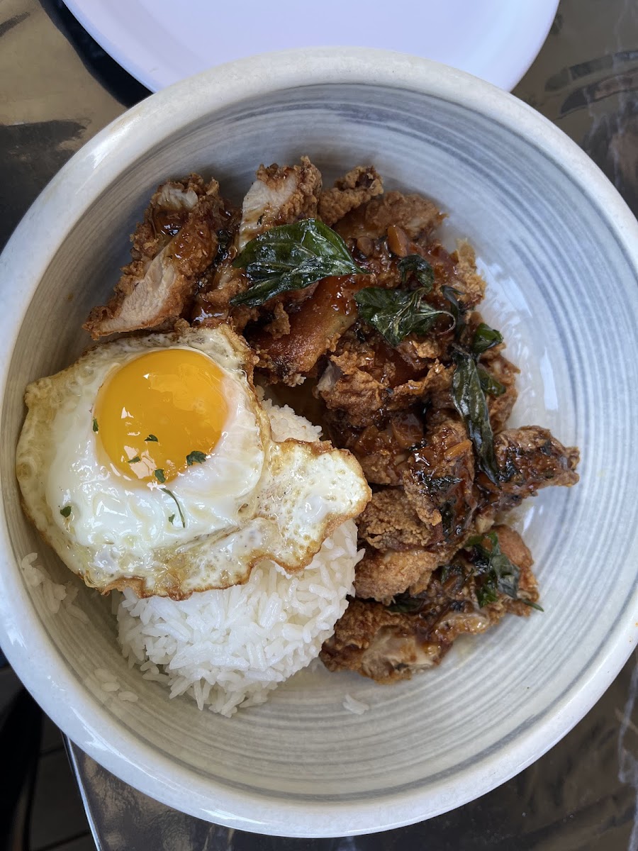 Unassuming Thai restaurant serving lots of tasty stir-fry, rice, noodle dishes and more. The spice level is indeed there, if you ask for it. The fried chicken is crispy on the outside and soft on the inside. Service was efficient and friendly. Outdoor seating can be a bit noisy due to cars, but it’s not too bad. Recommended!